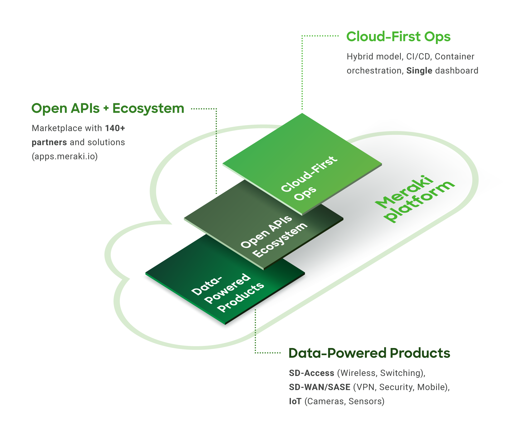Die Stärke von Cisco Meraki liegt in seinem ganzheitlichen, mehrschichtigen Ansatz. Die Basis bilden „Data-Powered Products“ wie SD-WAN/SASE für sichere Weitverkehrsnetze, IoT-Konnektivität sowie SD-Access für drahtlose und kabelgebundene Netzwerkinfrastrukturen. Darauf aufbauend bietet Meraki eine offene API und ein Ökosystem mit mehr als 140 Partnern und Lösungen. „Cloud-First-Ops“-Funktionen ermöglichen schließlich ein hybrides Bereitstellungs- und Betriebsmodell mit zentralem Management über die Cloud.