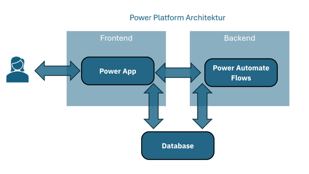 The implementation of authorizations is part of the business logic and is usually mapped in the backend. This ensures that the database is in a consistent state in terms of content. Power Apps in combination with Power Automate quickly reach their limits. This is illustrated by a look at the common architecture of a Power Platform solution consisting of a canvas app and several Power Automate flows: