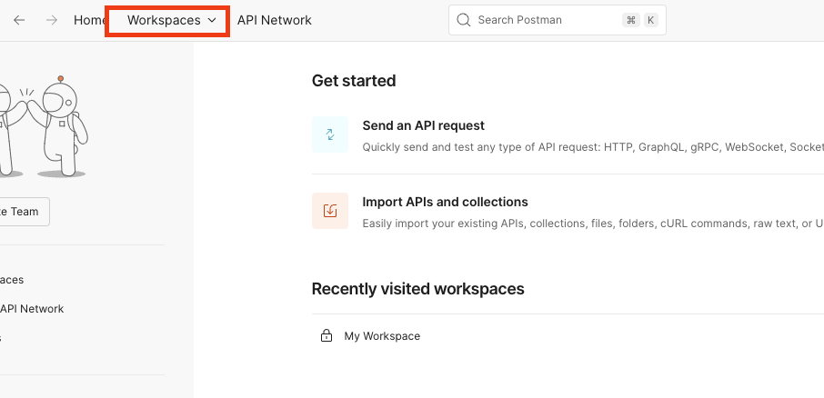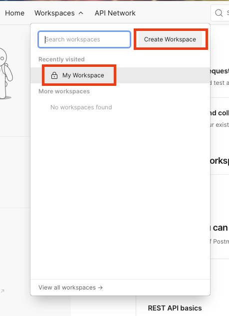 On the Postman homepage, select Workspace.