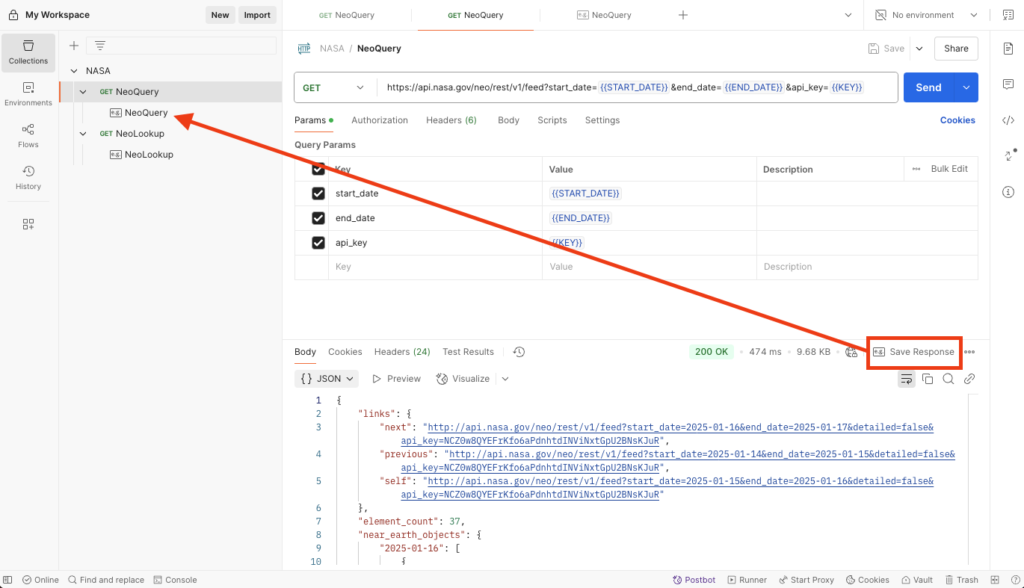 Click Run to execute the flow. This will retrieve the NEO data for your date range and then perform individual lookups for each NEO.