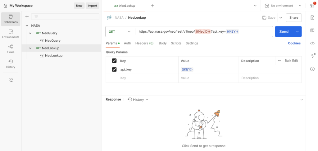 NeoLookUp: Once you have a specific NEO’s ID, you can use the NeoLookUp request to get more detailed information about it. This includes data such as its orbital parameters, close approach data, and other relevant attributes. This request is useful for drilling down into specific NEOs that may be of particular interest due to their characteristics or proximity to Earth.