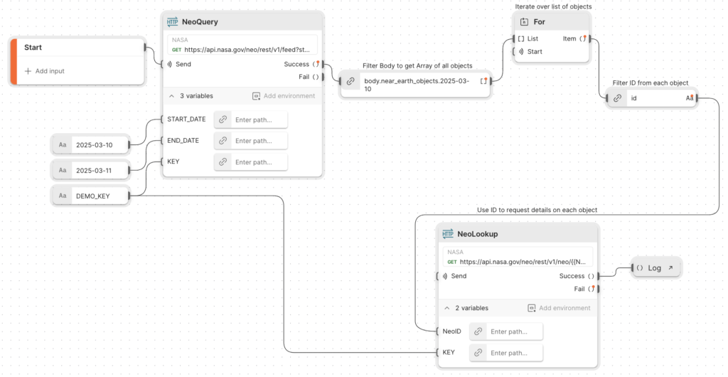 The flow connects to the Near-Earth Object API.