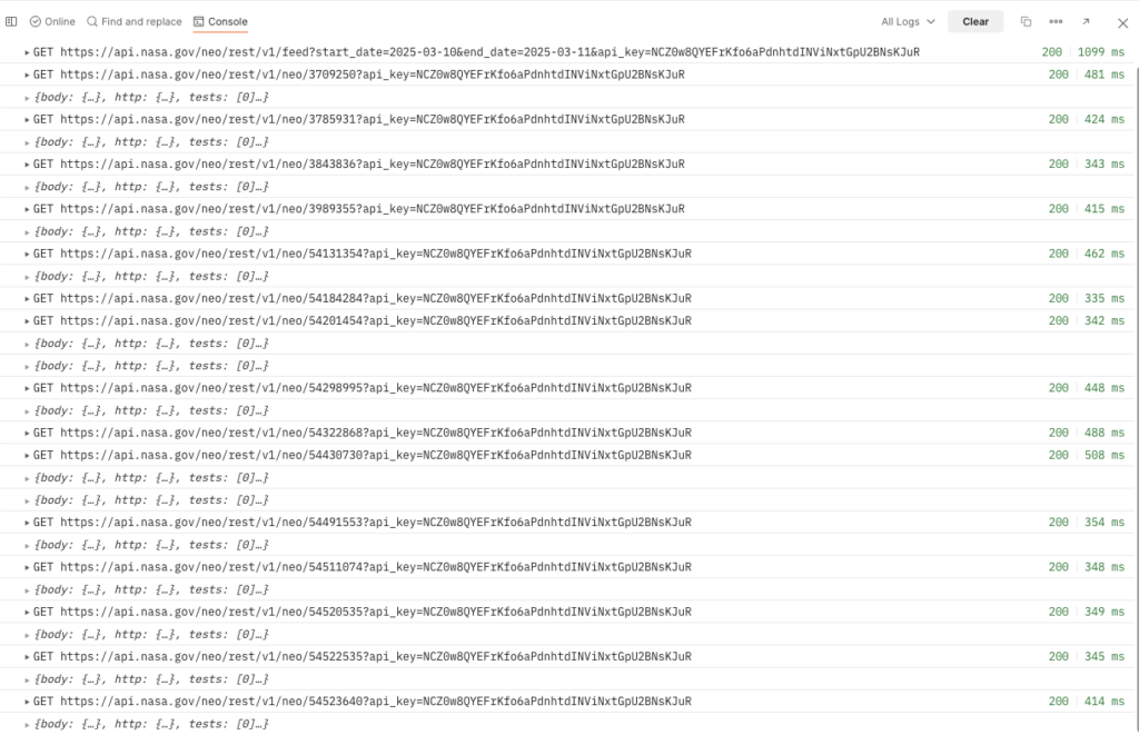 NeoQuery: This endpoint allows you to query a list of near-Earth objects (NEOs) over a specific date range. You can enter the date range as query parameters, and the response will provide information about the NEOs observed within that range. It returns data such as the NEO’s ID, name, estimated size, approach date, and miss distance, which helps analyze trends or events in space.