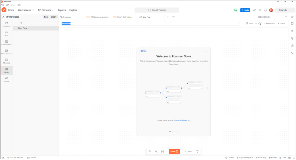 The Postman Flows workspace is organized with a drag-and-drop interface where you’ll build workflows using blocks that represent different actions. The interface includes: