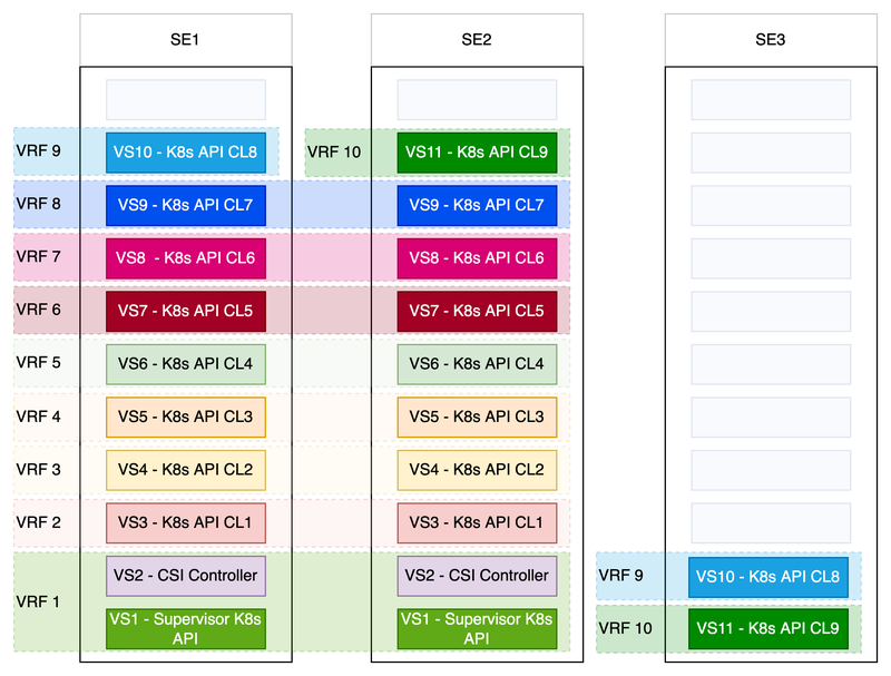 To visualize this procedure we created two drawings. The first drawing shows the number of Service Engines and the distribution of the running virtual services with nine vSphere Namespaces and one K8s Cluster per vSphere Namespace. Based on the corresponding Service Engine Group each of those Service Engines is allowed to run 11 virtual services. Further the drawing shows eleven virtual services. One virtual service for the K8s APi of the Supervisor cluster, one for the CSI controller and nine for the running K8s clusters. The virtual services for the Supervisor K8s API and the CSI controller are running in the same VRF and the different K8s clusters are running in dedicated VRFs. One VRF for each vSphere Namespace. As you can see we do have two Service Engines deployed, since the Service Engine Group is running in HA Mode N+M and one additional Service Engine is required to cover the outage of one Service Engines an still have enough capacity to maintain all running virtual Services.