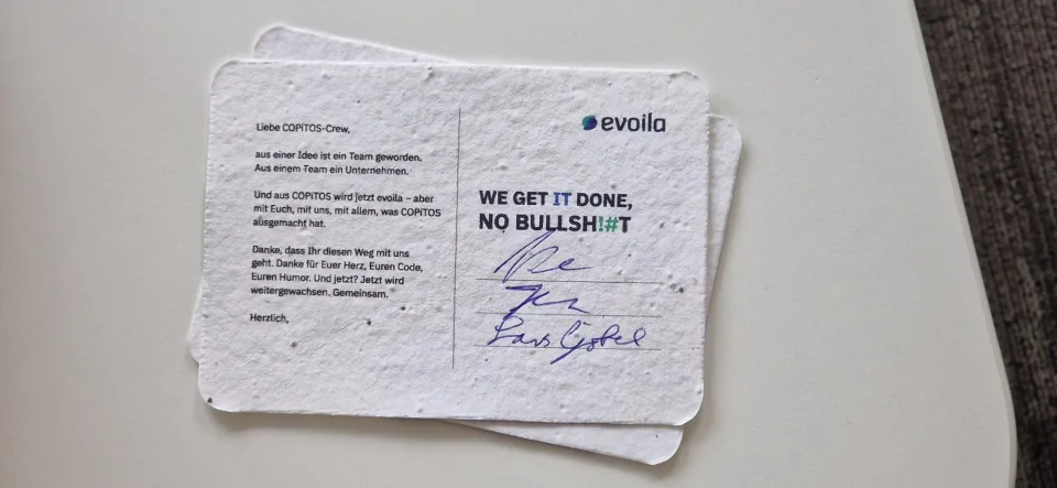 Even though the COPiTOS brand name will no longer be used in the future, it will remain a defining part of our history – just like the team, the culture and the attitude. Elements such as logos and signs will gradually be transferred to the evoila look and feel. The identity remains – it lives on in evoila.