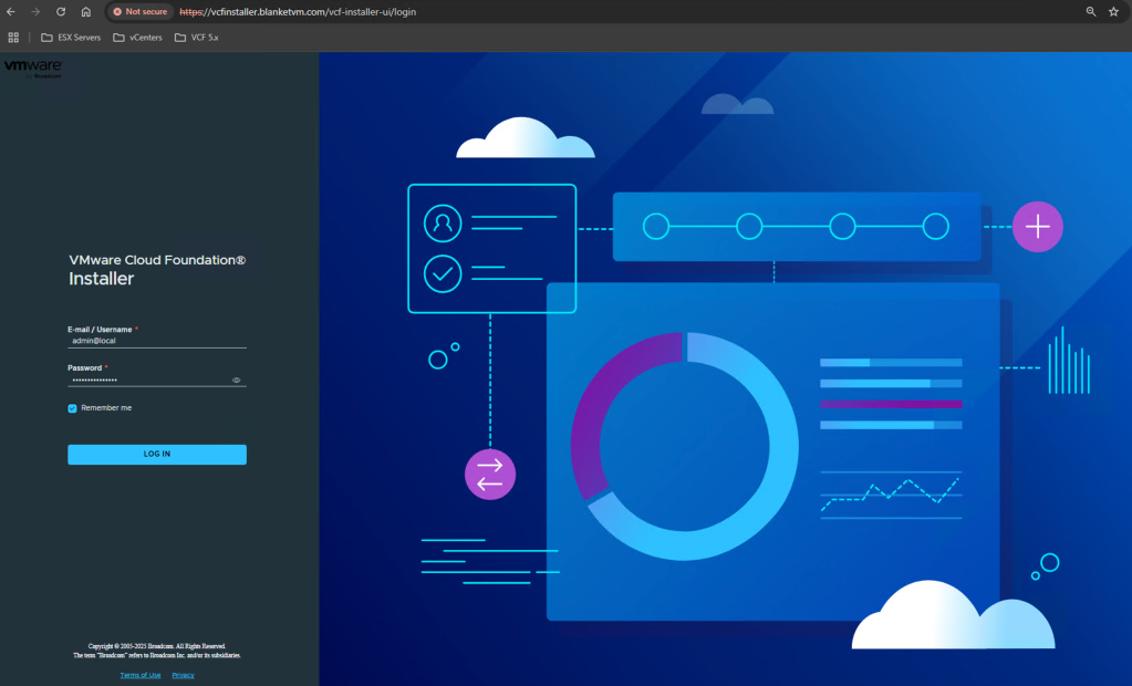 Zaloguj się do Instalatora VCF, wdrożonego w pierwszej części, używając użytkownika: admin@local. W moim przypadku to: https://vcfinstaller.blanketvm.com.