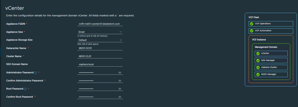 Podaj FQDN i hasła dla SDDC Managera. UWAGA: Jeśli zainstalowałeś VCF Installer na pierwszym węźle domeny zarządzającej, zostanie on SDDC Managerem. W przeciwnym razie zostanie wdrożony nowy appliance.