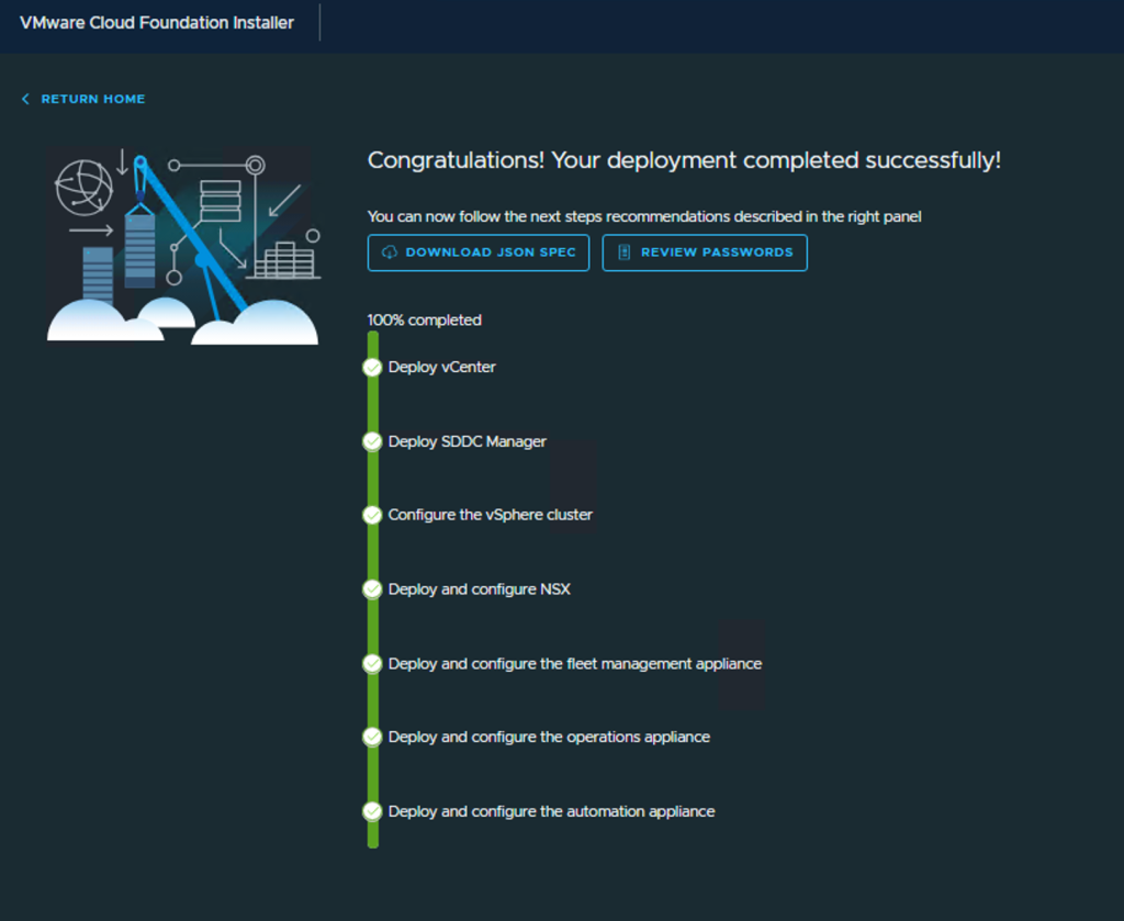 – Konfiguracja magazynu Online Depot. – Wdrożenie instancji VCF, w tym: vCenter, Fleet Management, SDDC Manager, NSX Manager, VCF Operations oraz VCF Automation.