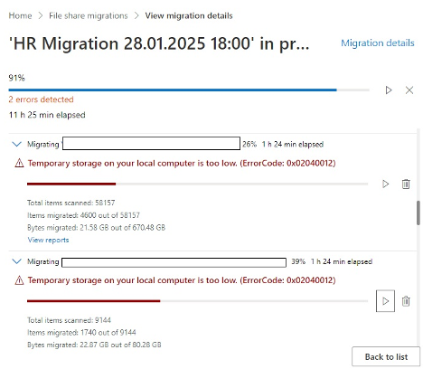 Przy bardzo dużych zadaniach migracyjnych (np. 500 GB w jednym transferze) zdarzał się brak wolnego miejsca na dysku maszyny wirtualnej wykorzystywanej do migracji. Podobne problemy występowały przy transferze mniejszej liczby bardzo dużych plików, gdy system nie mógł efektywnie wyczyścić przestrzeni buforowej.