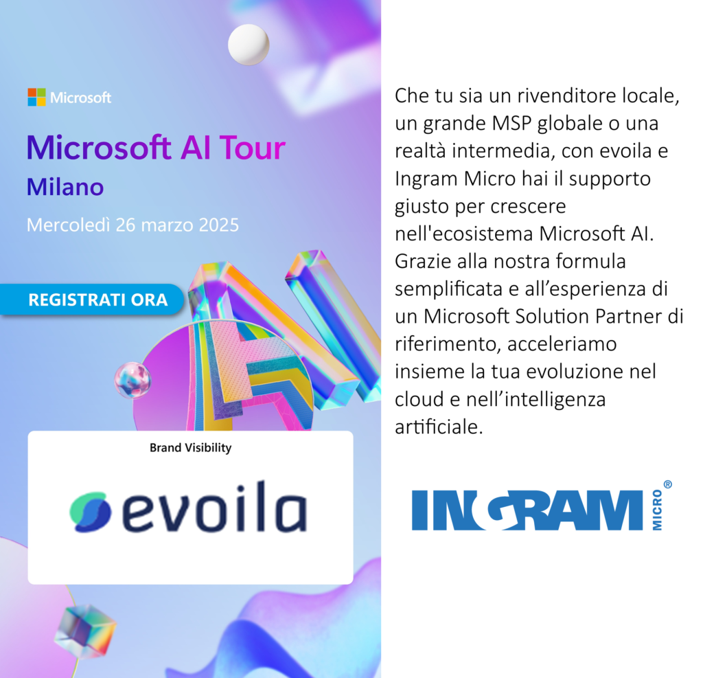 evoila sarà Partner al Microsoft AI Tour 2025, l’evento di riferimento per l’intelligenza artificiale e l’innovazione tecnologica. In questo percorso, evoila è affiancata da Ingram Micro Inc., uno dei più grandi distributori e partner a livello mondiale di prodotti Microsoft, per offrire competenza, innovazione e un percorso semplificato verso il successo nell’AI e nel cloud.
