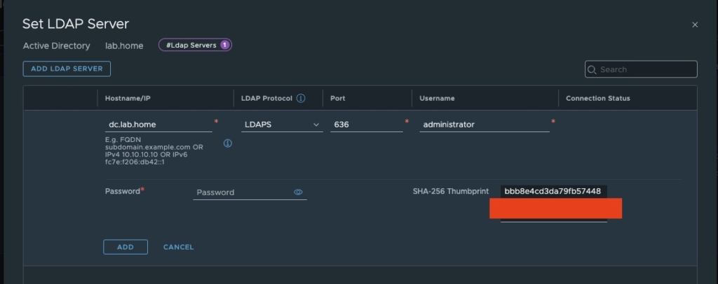 Attention: If LDAPS is used, NSX imports the SHA thumbprint of the domain controller certificate. As the certificate is usually renewed automatically after 2 years at the latest, NSX loses the trust with the domain controller. In this case, the trust must be established manually. To do this, delete the thumbprint and reconnect to the bind user. It has proven to be practical to monitor certificate expiry times and to enter at least 2 domain controllers that exchange their certificates with a 4-week time lag. If the trust fails completely, no more identity rules are applied and the default firewall rule comes into effect. In practice, this should be an any/any default drop and log rule.