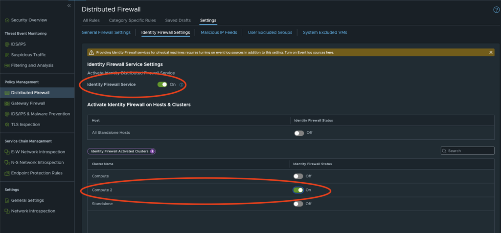 After we have successfully setup and synchronised our domain, we only need to activate the Identity Firewall. By default, this feature is disabled (it is a free feature that is available with the NSX Firewall VCF add-on). To activate the Identity Firewall, go to Security -> Distributed Firewall -> Settings -> Identity Firewall Settings and activate the identity firewall service button. Then we select the cluster on which we want to activate the service.