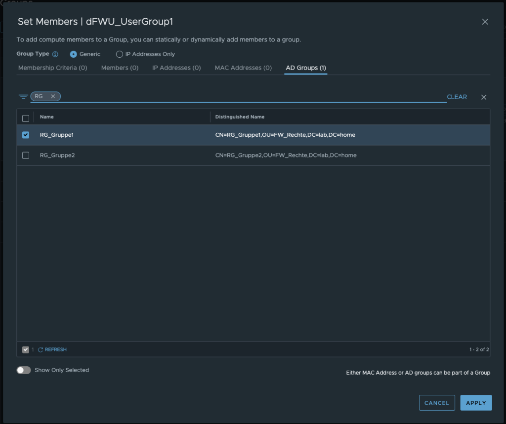 So we create our first LDAP user group. As with any group, we can do this either when creating the rules or in the inventory under Groups. The process is the same as for a normal Distributed Firewall Group, except that we don’t use tags but Distinguished Names, which can be conveniently selected or filtered from the synchronised AD elements.