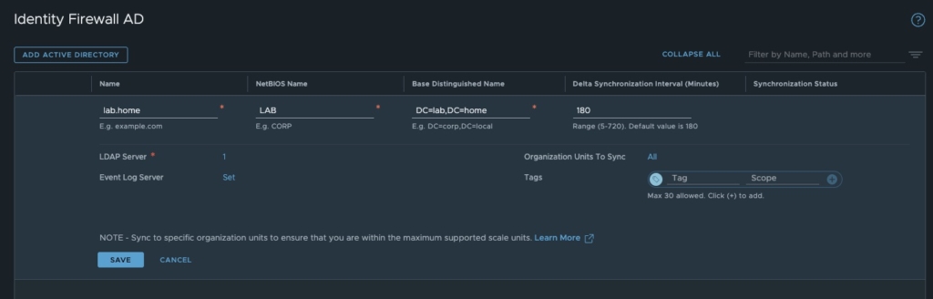 This is done in the NSX Manager under System -> Identity Firewall AD. Several domains can be entered so that multi-tenant setups can also be realised. The NSX Manager requires firewall activations and must be able to reach the domain controllers via LDAP or LDAPS. I strongly recommend the use of LDAPS. These settings can also be used to perform a manual sync or check the synchronisation status.