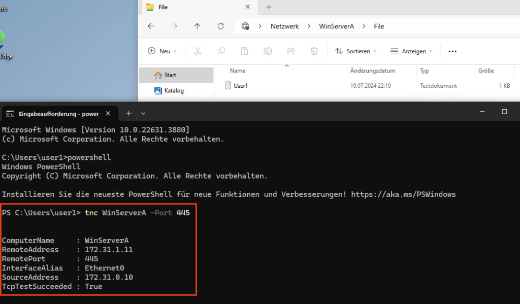For testing, I log in to my VDI with the credentials of User1 and perform a TestNetConnection with Powershell. This is a simple and quick way to test TCP connections. I also open a share on the file server.